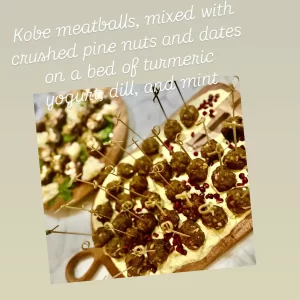 Mix and roll into mini meatballs.Bake for 15-20 minutes at 425 degrees. Spread the sauce on a platter, woodboard or whatever vessel you like. Place the meatballs on the sauce and stabwith a bamboo toothpick.