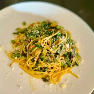 Lemon Spaghetti -with Peas, Shallots, Tomato, Baby Spinach & Parmesan