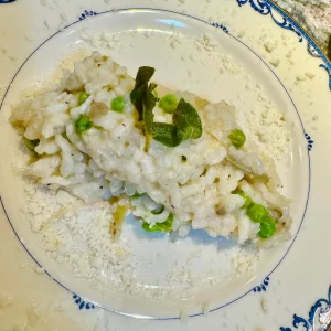 Fry the sageHeat a thin layer of olive oil in a small pan over medium heat. Add sage leaves and fry until crisp, about 15–20seconds. Remove to paper towels and sprinkle lightly with flaky salt. Set aside. Start the risottoIn a wide saucepan, heat olive oil and 1 Tbsp butter over medium heat. Add shallots and a pinch of salt. Cook until lightly browned. Toast the riceAdd rice and stir to coat with fat. Cook 1–2 minutes until the grains look slightly translucent at the edges. DeglazePour in tequila and stir until fully absorbed. Cook the risottoOn medium to high heat, begin adding warm stock, one ladle at a time, stirring frequently. Allow each addition to absorb before adding the next. Continue for about 15 minutes. Add the peas with the next addition of stock. Cook until rice is tender with a slight bite, about18–20 minutes total. FinishRemove from heat. Stir in half stick butter and grated cheese. Season with salt and pepper. RestLet rest uncovered for 1 minute for a creamy finish. To ServeSpoon risotto into warm bowls.Top with fried sage leaves and grated parmesan